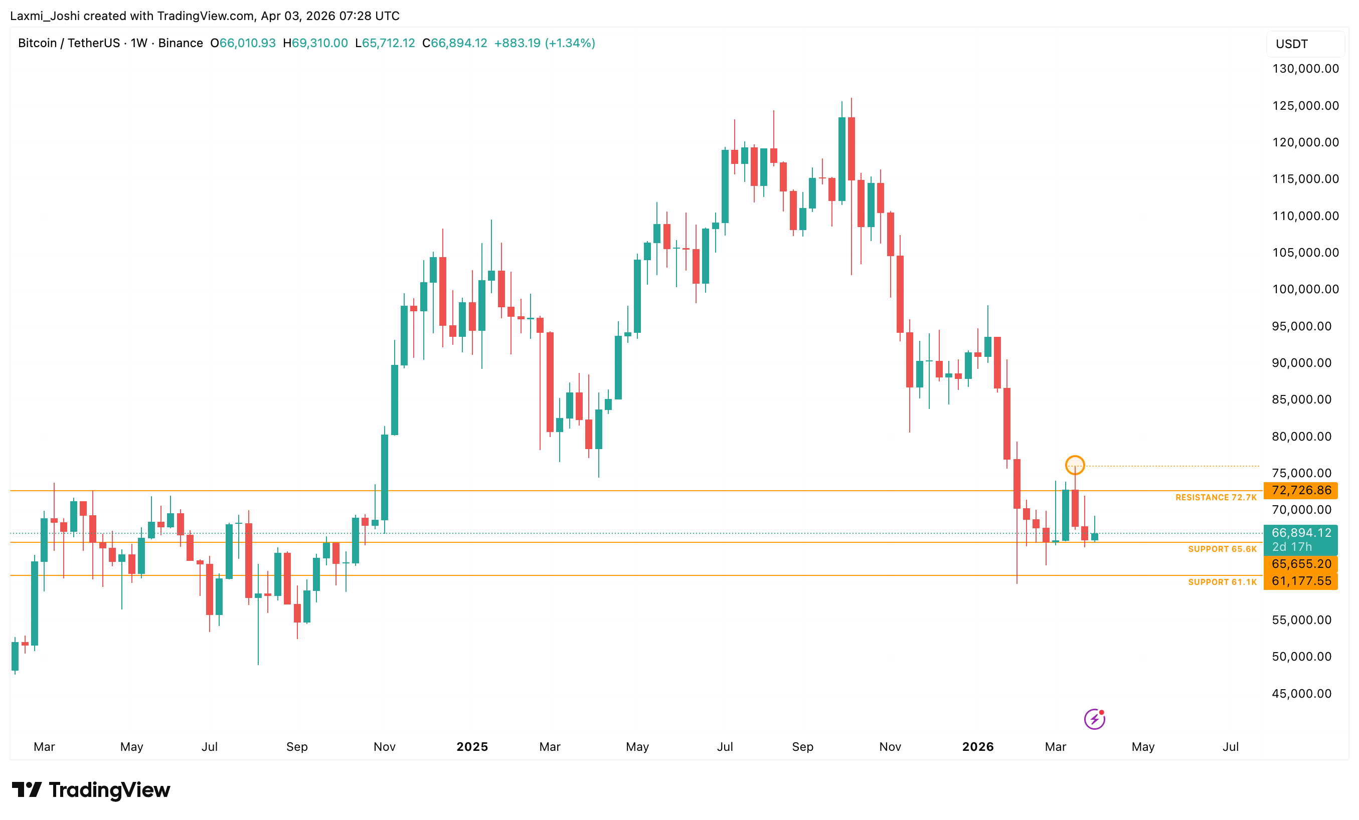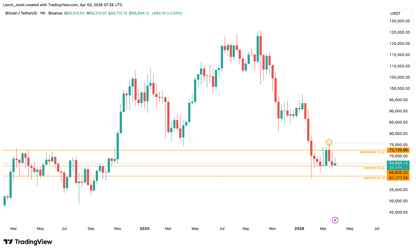 Bitcoin has repeatedly found support at the 65,600 level, despite the broader downtrend remaining intact. A breakout attempt above 76,000 was met with rejection. Key levels to watch are resistance at 72,700 and support at 65,600.