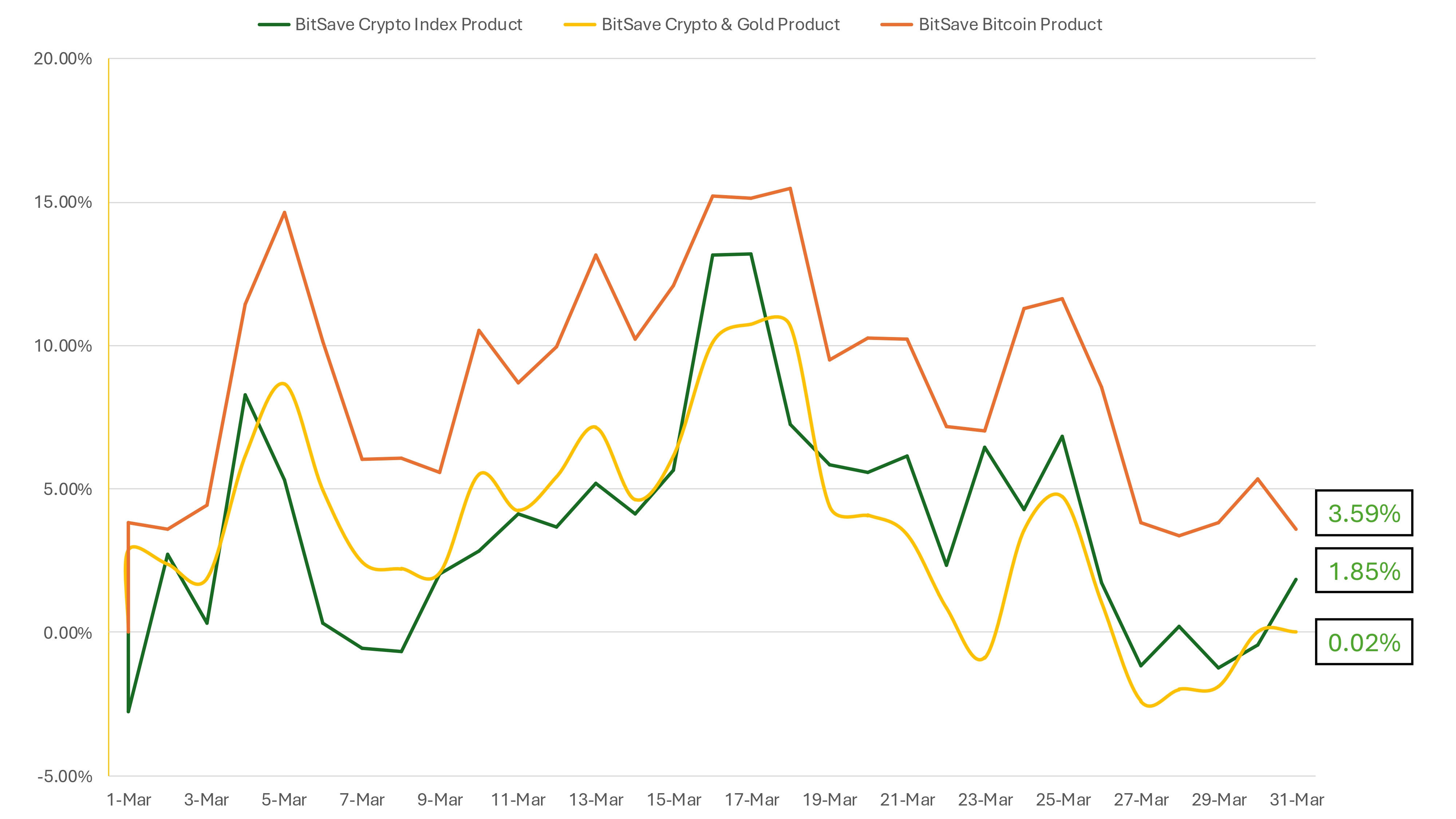 Crypto & Gold Product: Up 0.02%, delivering a near-flat return for the month. While the gold allocation helped cushion February’s downturn, it also limited upside participation during March’s crypto-led recovery.