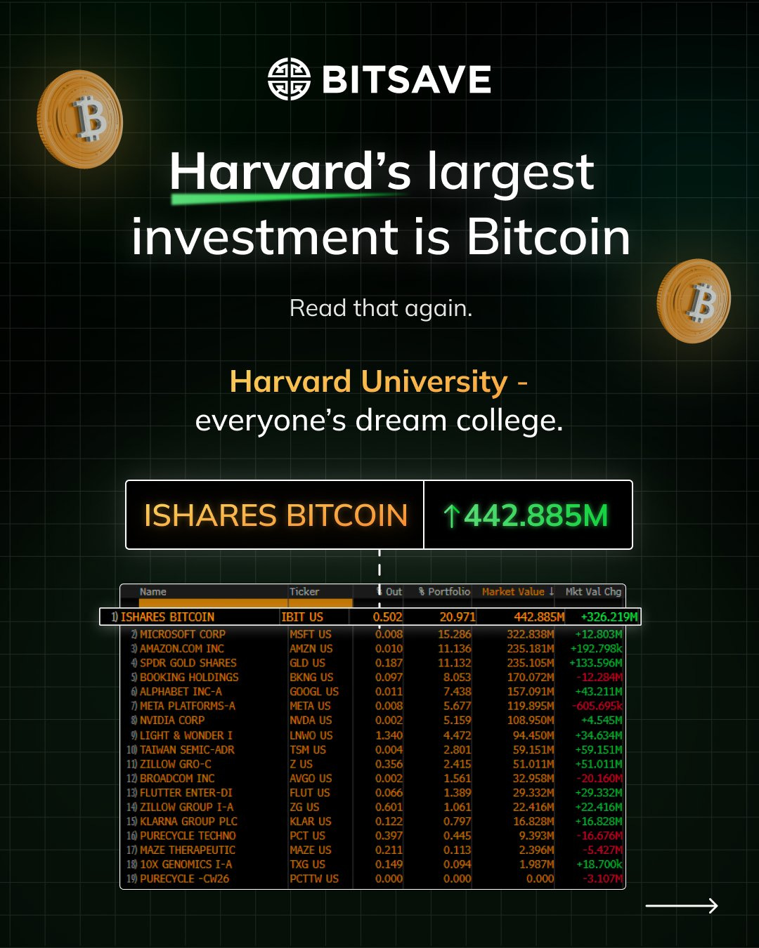 Harvard University’s endowment increased its Bitcoin holdings from $117 million to about $443 million through BlackRock’s Bitcoin ETF in the third quarter of 2025. At the same time, it raised gold ETF investments from $102 million to $235 million. This means Harvard allocated roughly twice as much to Bitcoin as to gold. The move shows growing confidence in Bitcoin as a way to protect against currency weakening. The University’s Bitcoin investment is also its largest holding, standing at 21% of its portfolio.