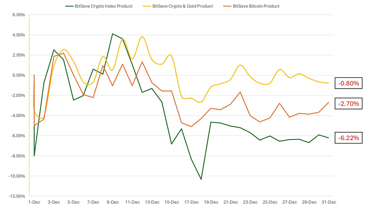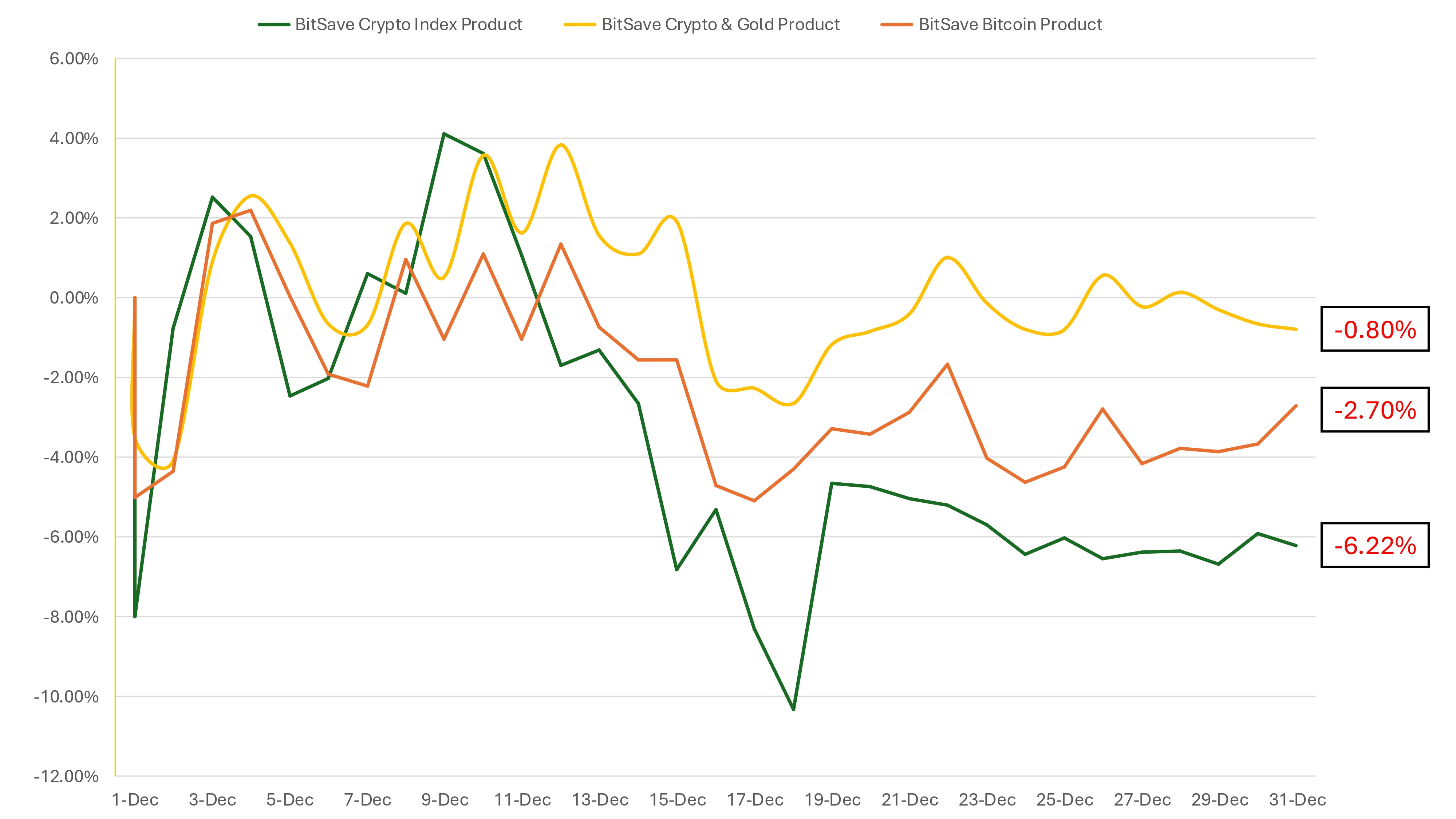 December 2025 was a defensive month across markets, and BitSave products behaved exactly as designed.