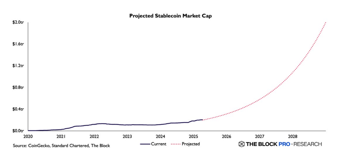 The numbers reflect this expanding role. The stablecoin market grew from under $10 billion in 2020 to over $200 billion by 2025 - and projections from Standard Chartered and The Block suggest the market could approach $2 trillion by 2028. That is not speculative hype; it is the market pricing in the reality that stablecoins are becoming core infrastructure for global payments, DeFi lending, and digital asset settlement. The trajectory on the chart is less a prediction and more a recognition that once a better rail exists, capital tends to flow toward it.