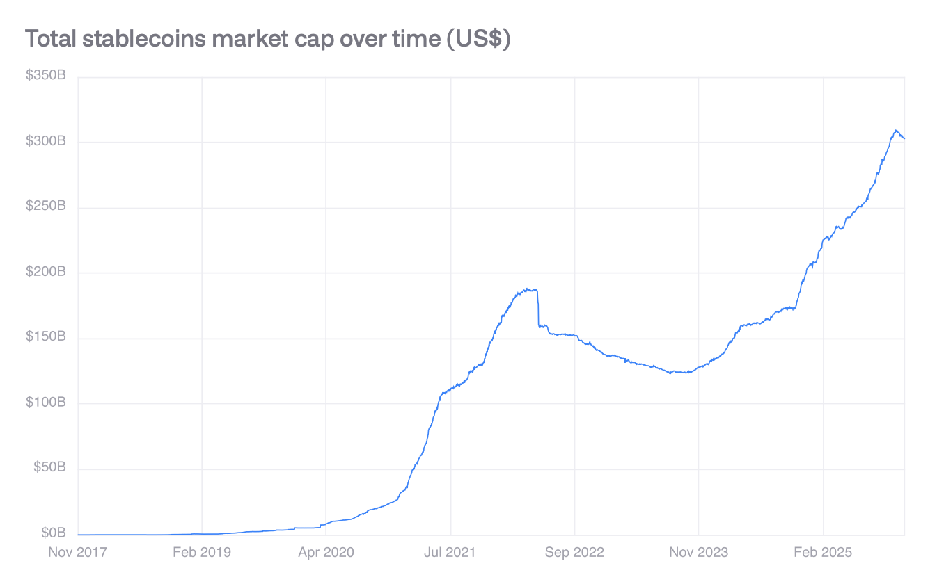 The real stress test came in 2021, when Decentralized Finance (DeFi) exploded into mainstream awareness. Suddenly, stablecoins weren’t just a convenience; they were the backbone of an entirely new financial system. Lending protocols let users deposit volatile crypto as collateral and borrow stablecoins against it, unlocking liquidity without forcing anyone to sell their holdings. Stablecoins also helped reduce impermanent loss, the risk that comes from providing liquidity in pools where asset prices diverge, by anchoring one side of the equation. The numbers tell the story plainly: the stablecoin market grew from $5 billion in 2020 to over $200 billion by 2025. In five years, a niche utility token had become the reserve currency of a parallel financial universe.