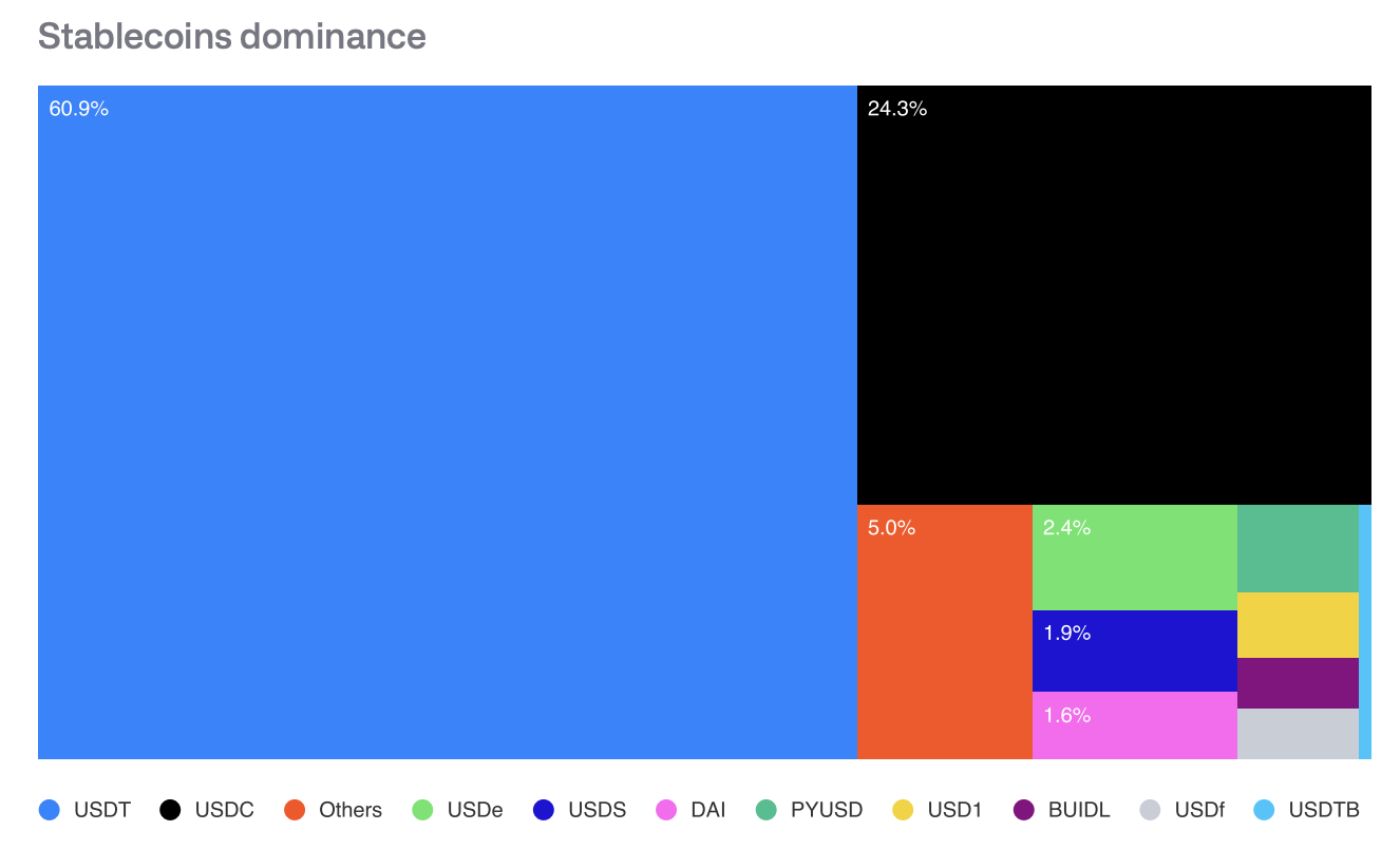 Though all are pegged to the US dollar, not all stablecoins are created equal. Tether (USDT) commands the largest market share with approximately $185 billion in circulating supply, making it by far the dominant force in the stablecoin market. Its nearest competitor, Circle’s USD Coin (USDC), holds a distant second place with roughly $75 billion in circulating supply - less than half of Tether’s footprint. Despite growing regulatory scrutiny and competition from emerging stablecoin issuers, Tether’s dominance remains largely unchallenged, cementing its position as the de facto liquidity backbone of the broader cryptocurrency ecosystem.